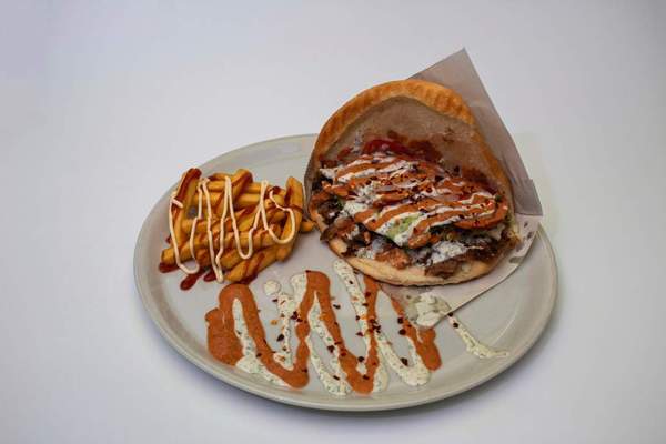 Veliki doner u kifli sa dodatkom pomfrita i zapecenog suhog mesa sa svim prilozima i sosovima