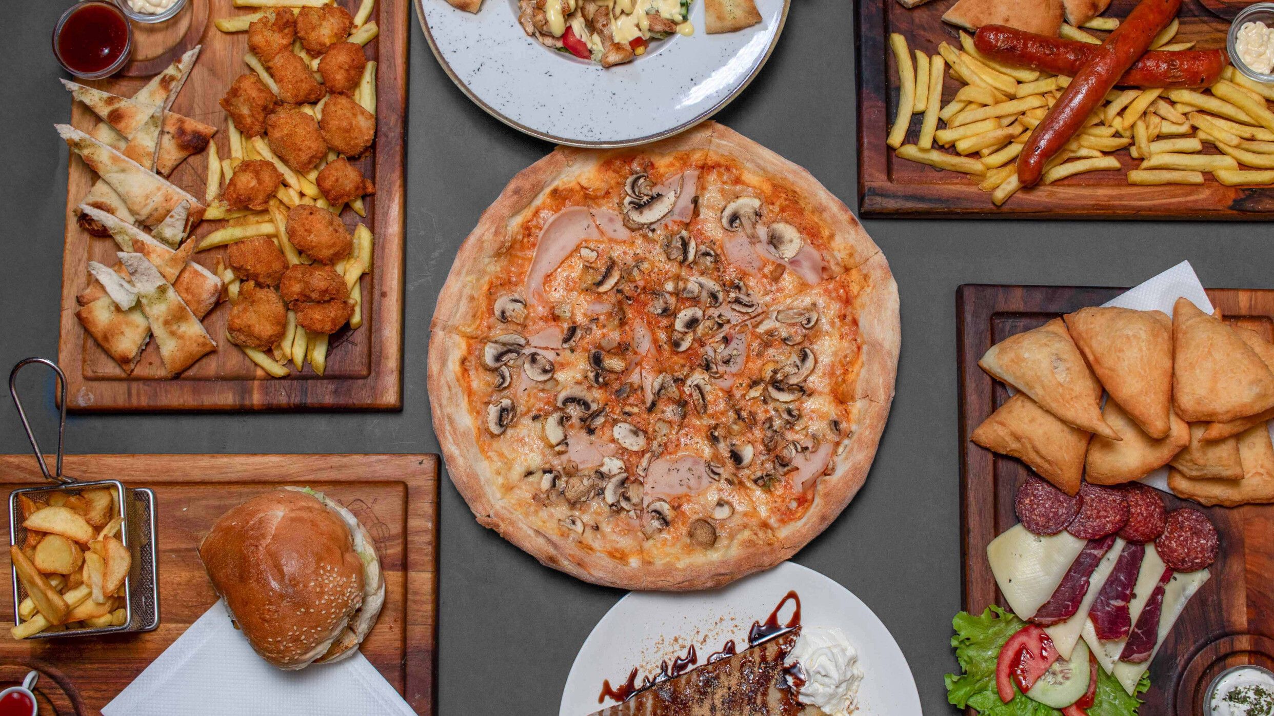 Kobasica, pohovani sir, onion rings, pileći nuggets, pomfrit, focaccia, BBQ sos