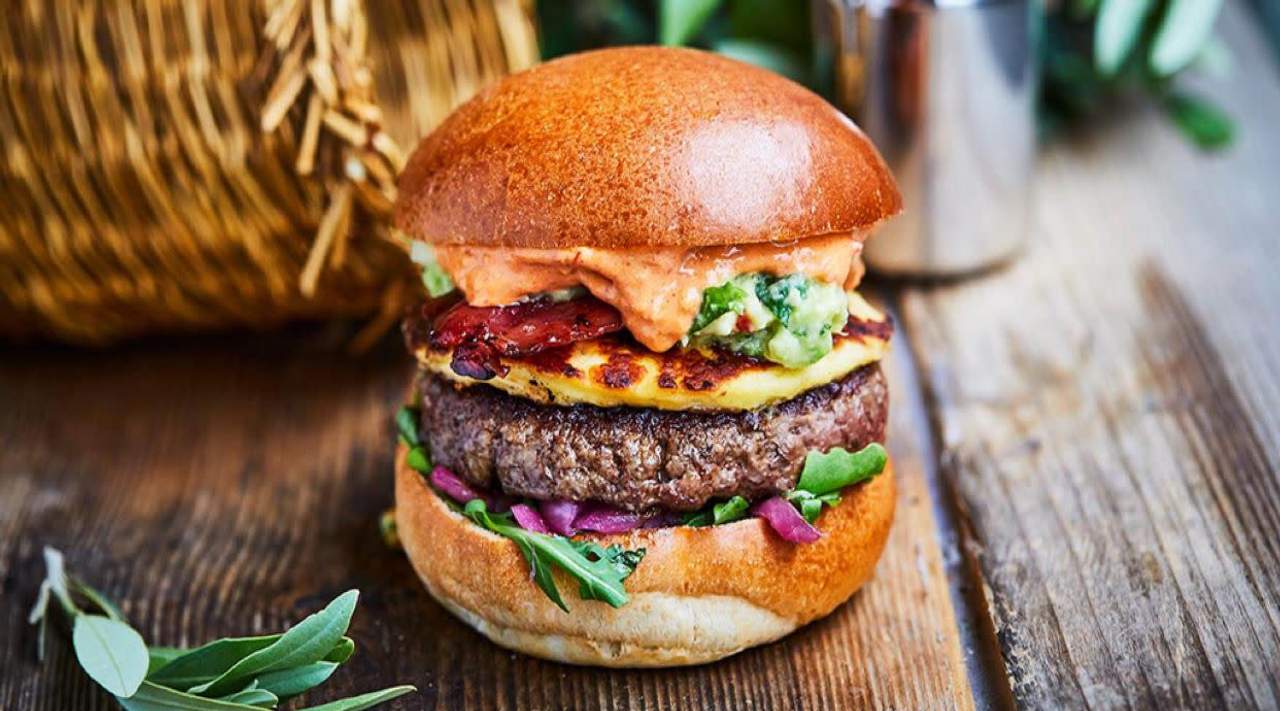 Бриош с телешко кюфте, чедър, бекон, сос, домат и салатен микс