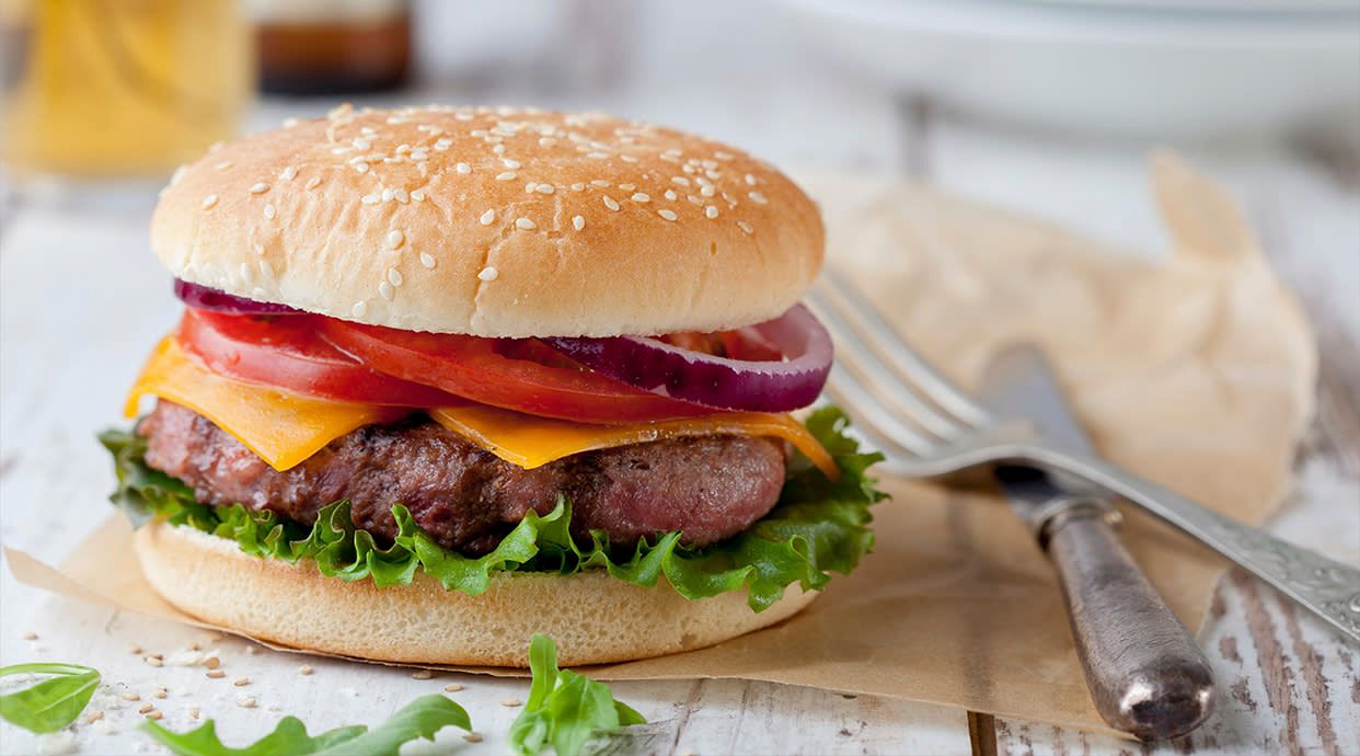 Сочен телешки бургер, чедър, бекон, кисели краставички, червен лук, домат, барбекю сос, майо сос и картофки