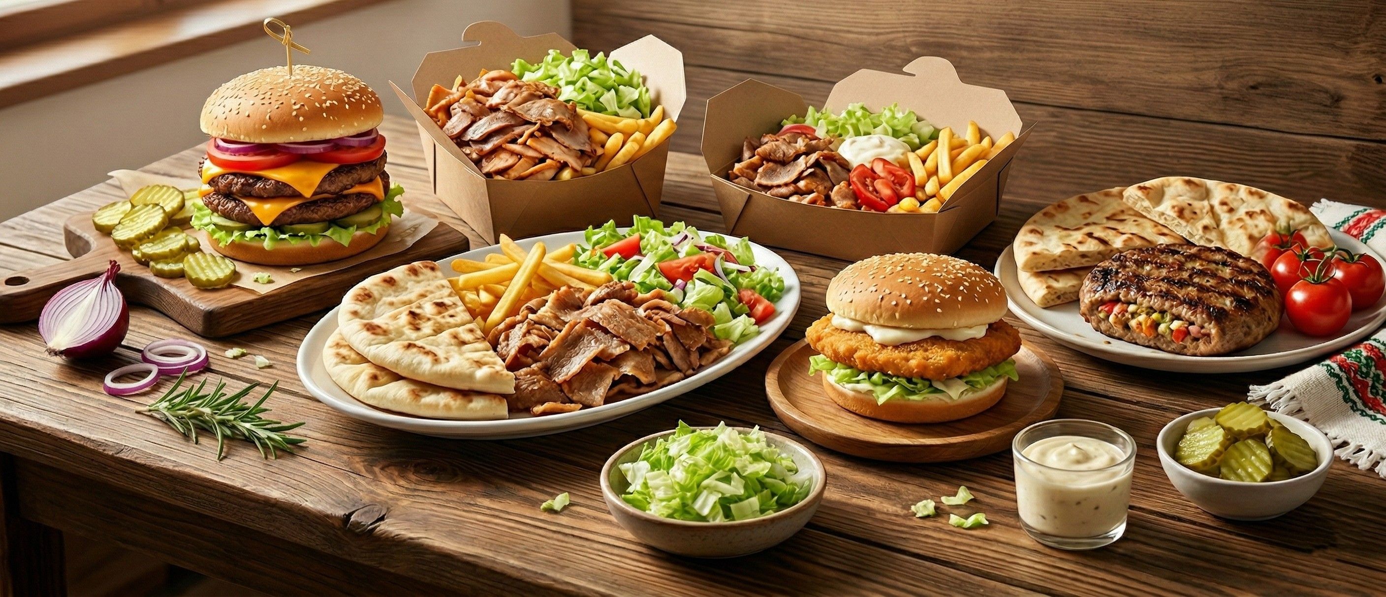 Питка бриош, бургер кюфте от 100% телешко месо, дюнер месо, сирене чедър, чедър сос, кисели краставички, домати, айсберг, пържен хрупкав лук - 300г