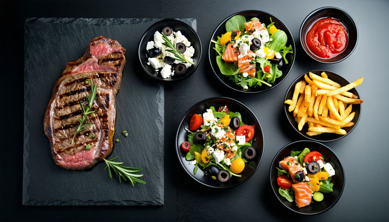 телешки стек, пепър сос, салата, чери домати, краставици, талиатели