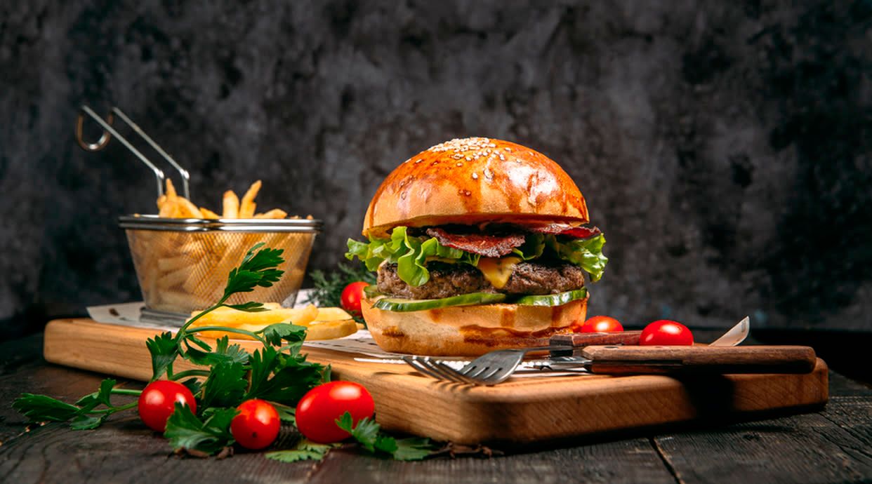 Бавно печено месо,препечен бекон,лук,кисели краставички,домат,питка бриош