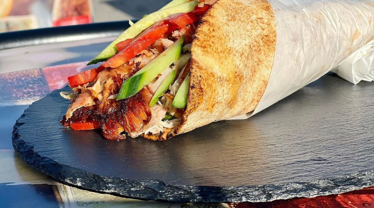 арабска питка, пилешко месо, пържени картофки, домат, краставица, кисели краставички, лук, зеле, чеснов сос