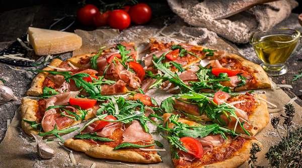 Доматен сос, моцарела, прошуто крудо, рукола, чери домат, пармезан