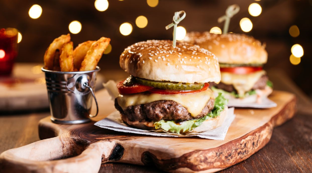 2бр. Телешко кюфте, Чедър, Гауда, Лук, Кисели краставички, Барбекю сос, Майонеза, Кетчуп. Гарнитура картофи и напитка.