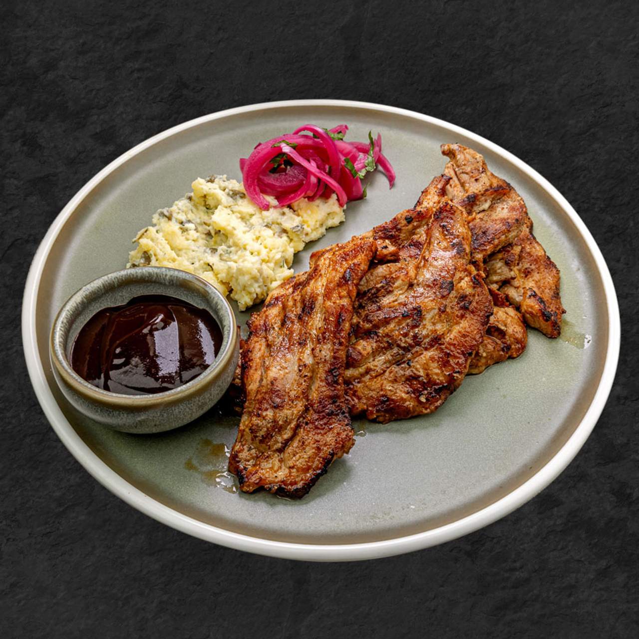 Поднесен със средиземноморска разядка , маринован лук, сос Барбекю - 450г
