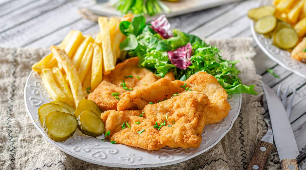Айсберг, хрупкави пилешки филенца, бекон, домашни крутони, сос цезар с аншоа и пармезан