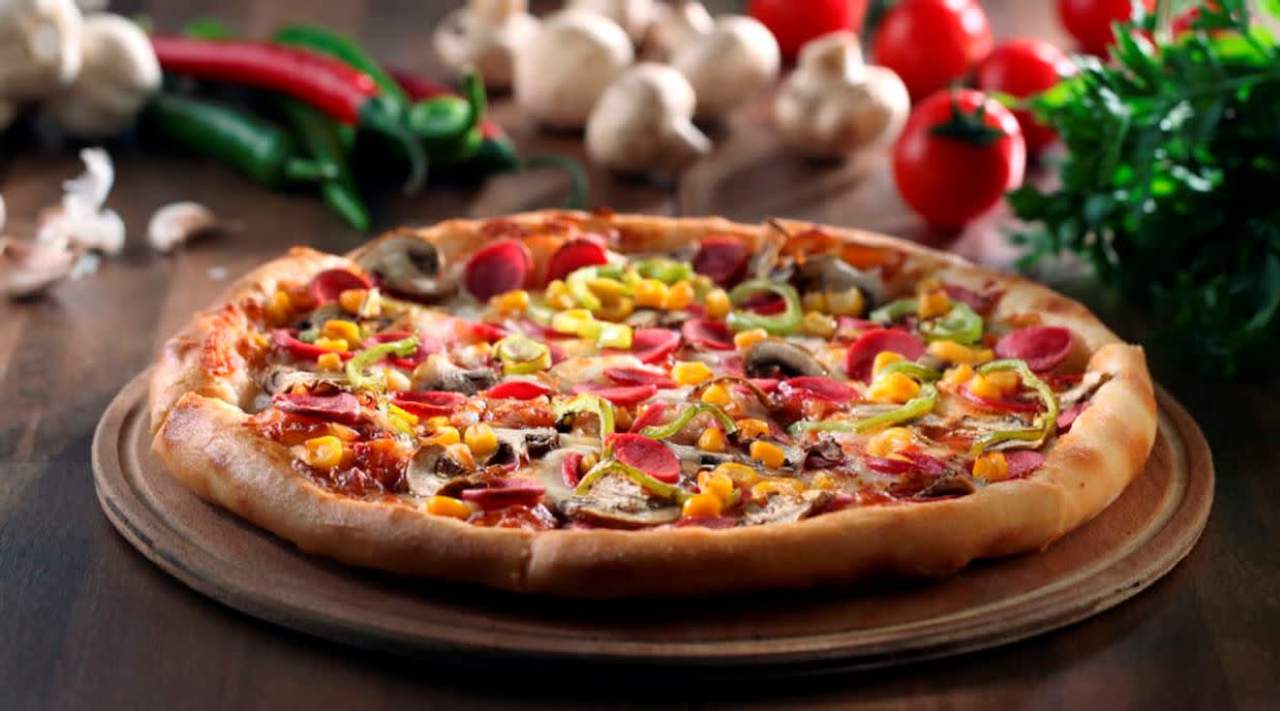 Доматен сос, кашкавал, шунка, маслини, гъби
