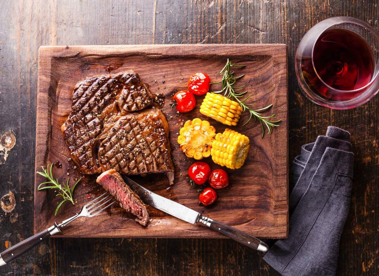 Говежди Рибай стек "Блек Ангъс" на скара гарниран с гриловани тиквички и задушени броколи в масло