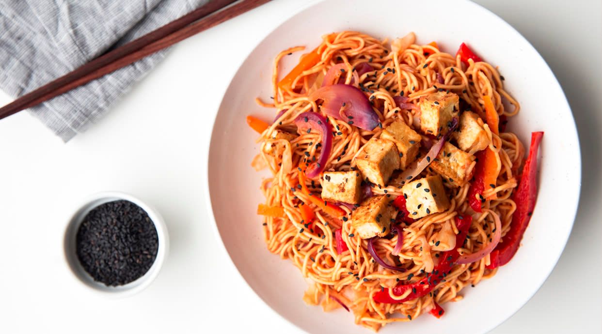 Оризови спагети със телешко зеленчуци и яйца