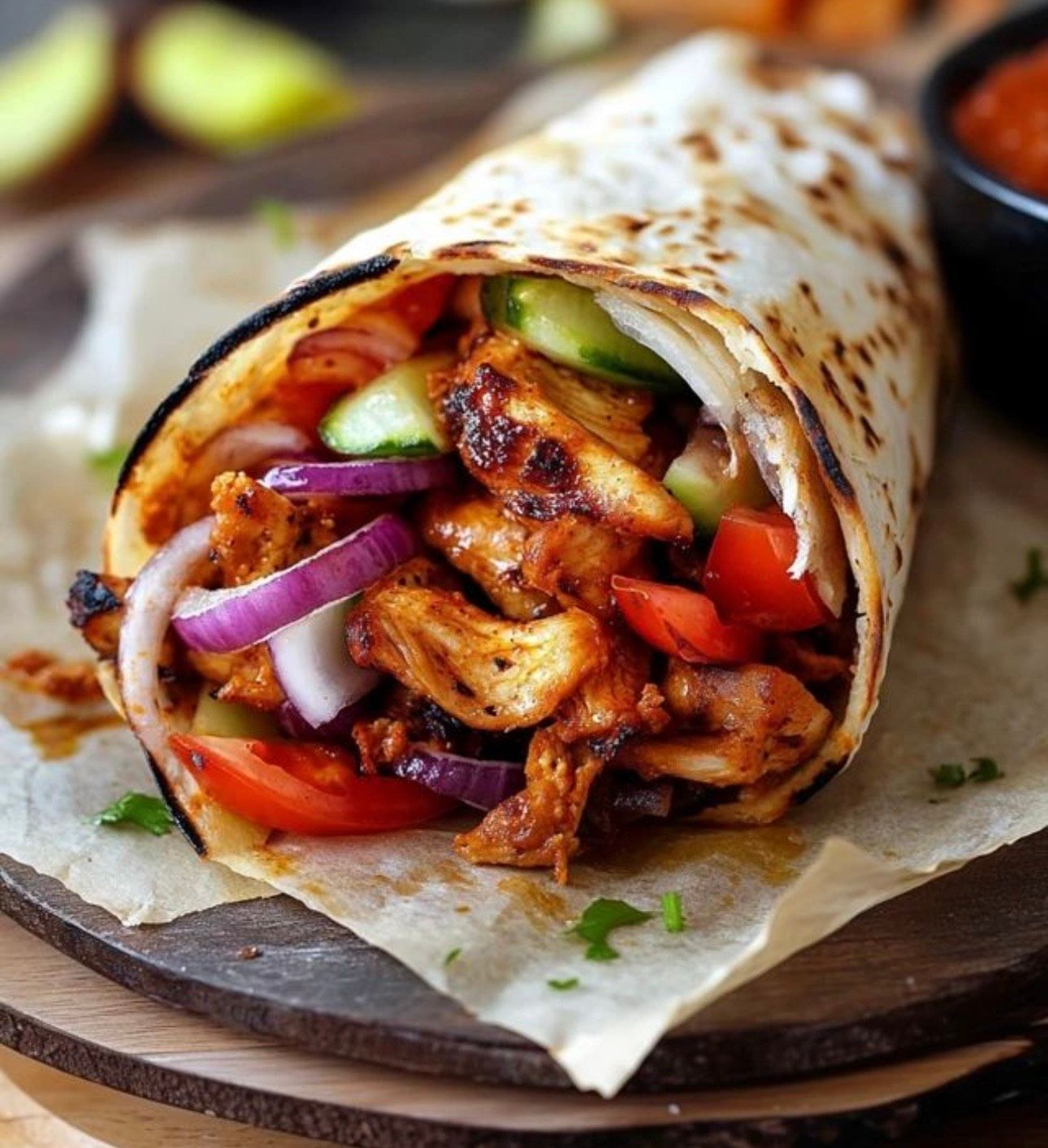 Питка лаваш, пилешко месо, домашно приготвен сос (чеснов, билков, пейпър,лют) , айсберг, зеле, лук, домати, пресни краставици - 400г