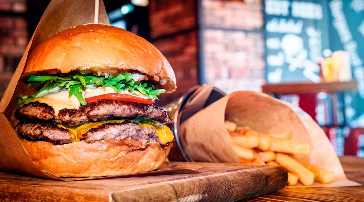 Говежди бургер Блек Ангъс по оригинална рецепта поднесен с Бриош и картофки - 300г