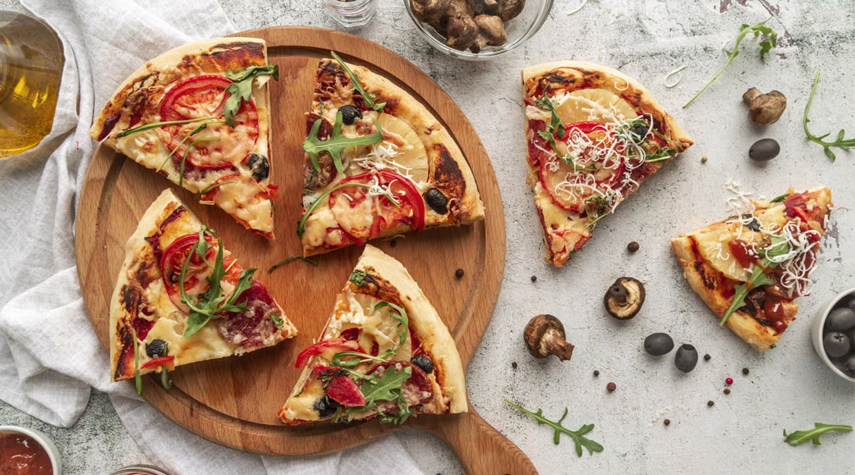 Доматена паста, бекон, шунка, гъби, пресен пипер, лук, риган, кашкавал