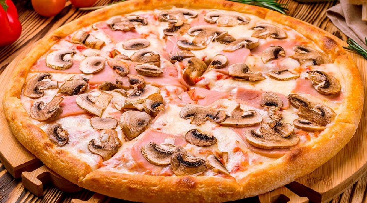 Доматен сос, гъби, шунка, кисела краставица, бекон, яйце, маслини, кашкавал