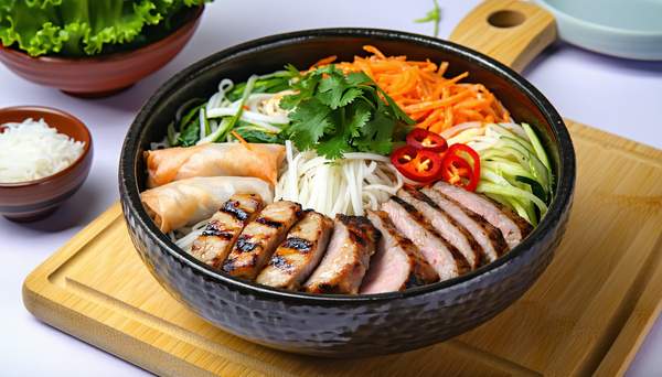 Salade, pâte bun, crudité aigre doux, nem au boeuf, poitrine de porc croustillante, menthe fraiche et coriandre
