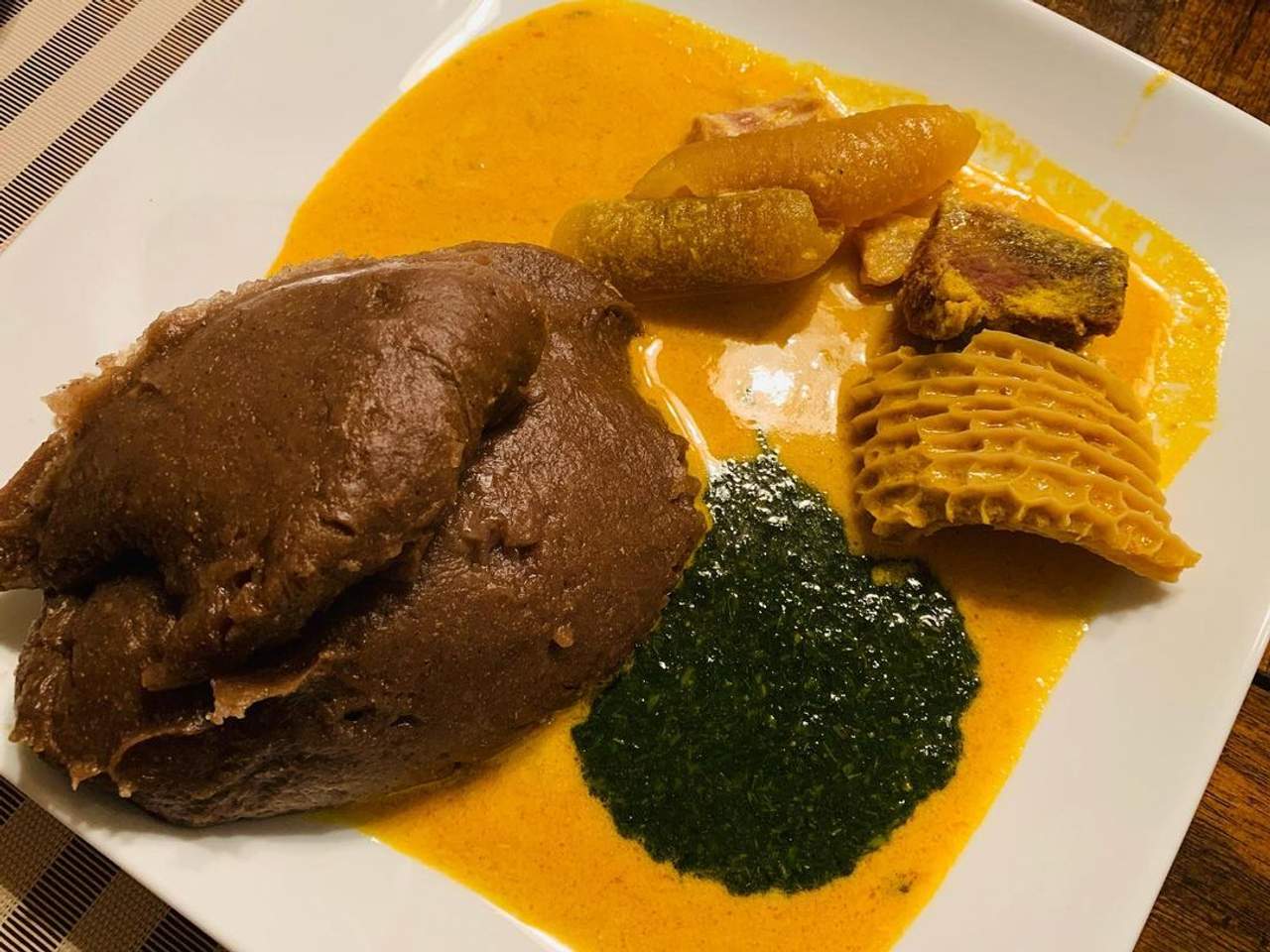 Plat fait avec de l'igname ou de manioc, ou de farine de plantain non mûre (abula). Écrevisses, haricots, huile de palme