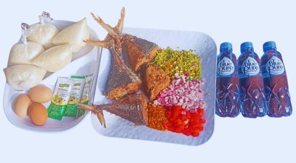 4 gros morceaux de thon frit, 5 boules d'attiéké, 3 oeufs durs, 3 sachets de mayonnaise, 3 petits bidons d'eau, condiments frais