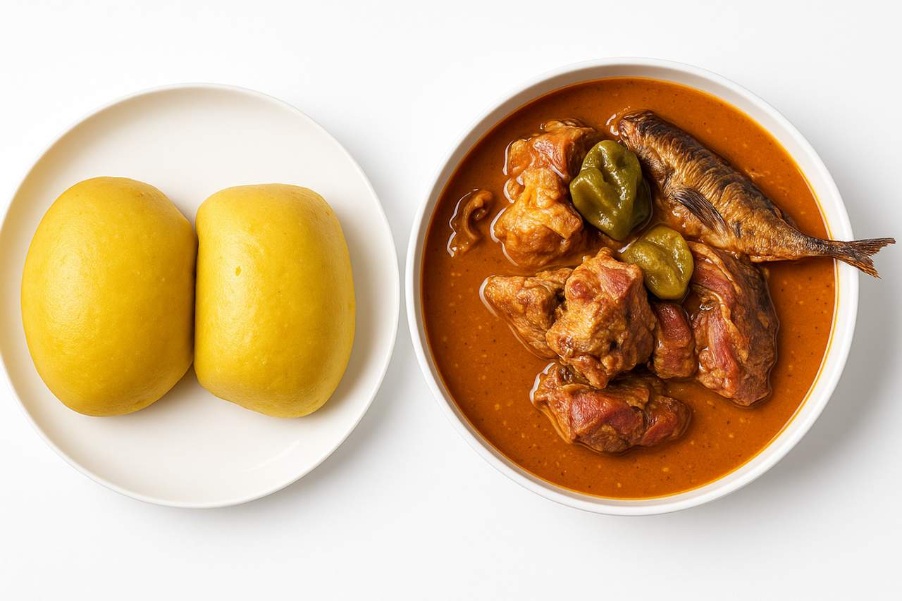 Sauce faite de jus de la graine de palme avec pintade de brousse fumé, pâte de bœuf, viande fraîche de bœuf et un accompagnement de votre choix