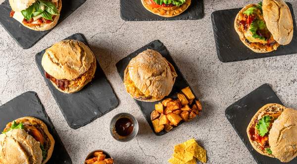 Hamburguesa vegetal con queso cheddar , cebolla caramelizada, tomate fresco, brotes tiernos y salsa chipotle(ligeramente picante) o barbacoa a elegir