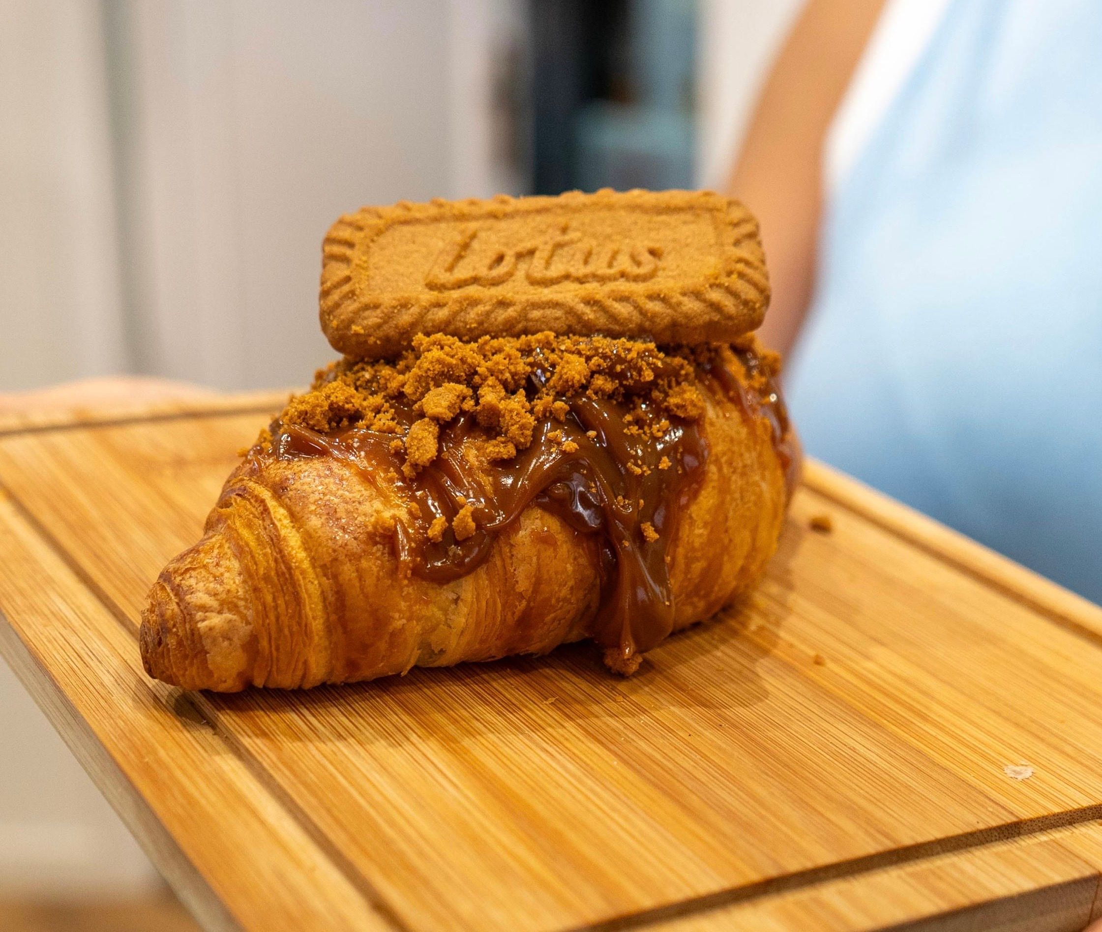 Croissant de mantequilla recién horneado relleno de crema de cacao.