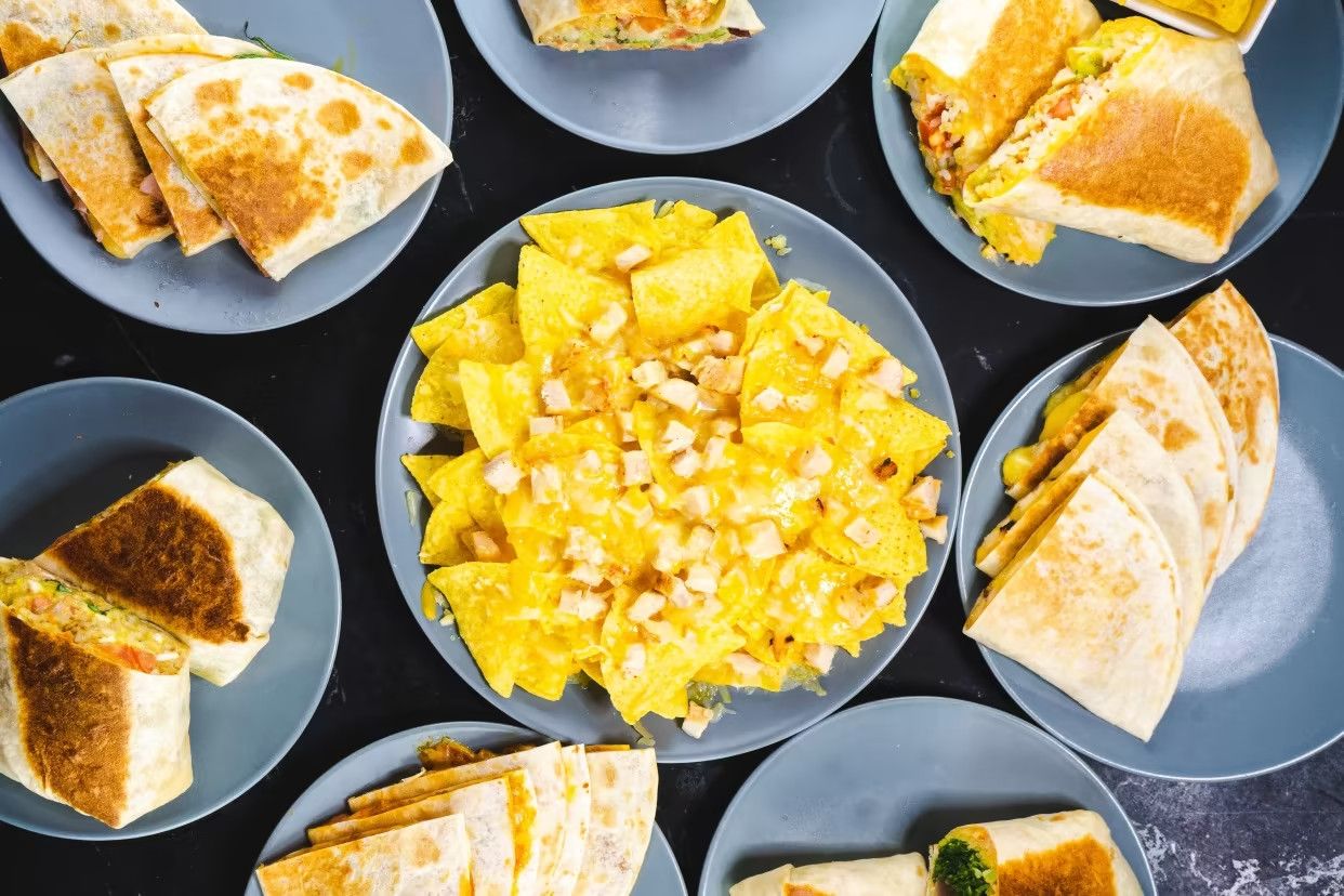 Quesadillas de jamón dulce, queso rallado, rúcula y guacamole para dippear.