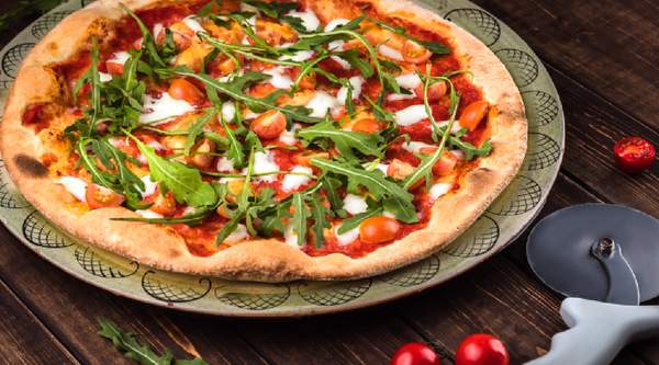 Tomate, mozzarella, jamón serrano, tomate cherry, parmesano, pistacho y rúcula