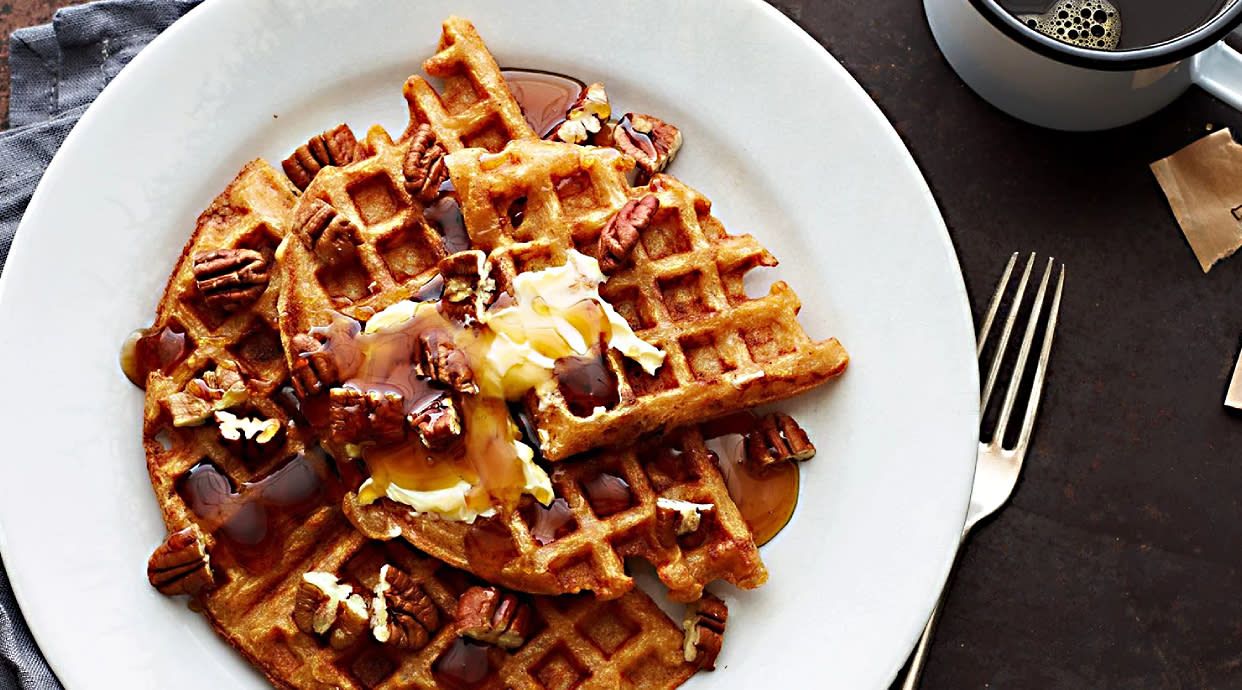 Cafe con leche acompañado de Waffle clasico con sirope de nutella