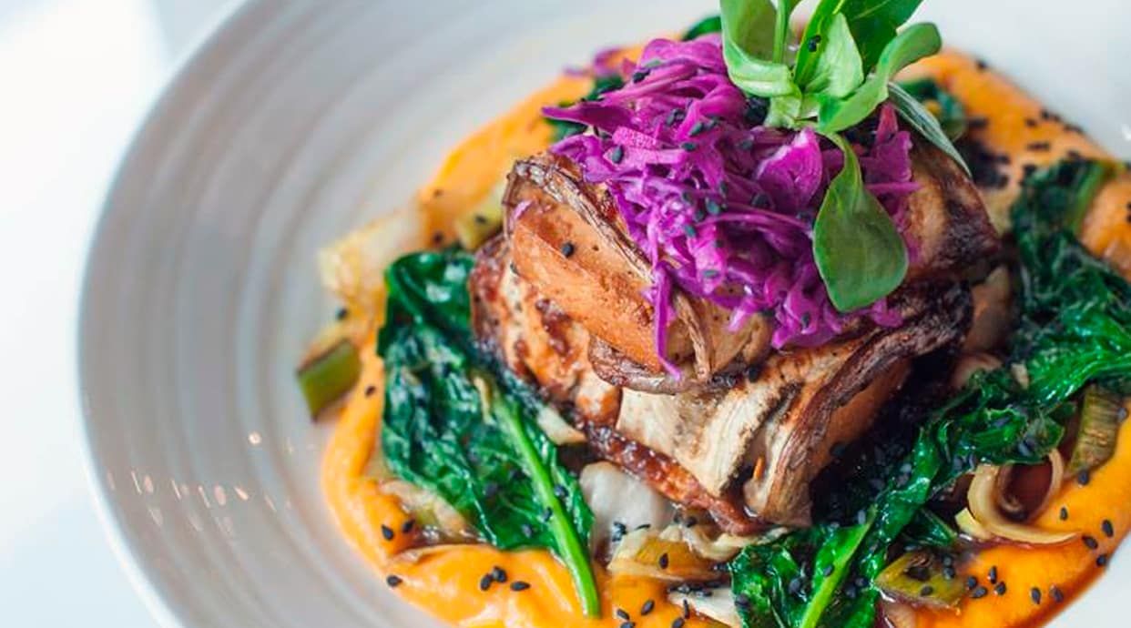 Farfalle en salsa cremosa de nata con espinacas frescas, boniato asado caramelizado y champiñones salteados, con parmesano rallado por encima.