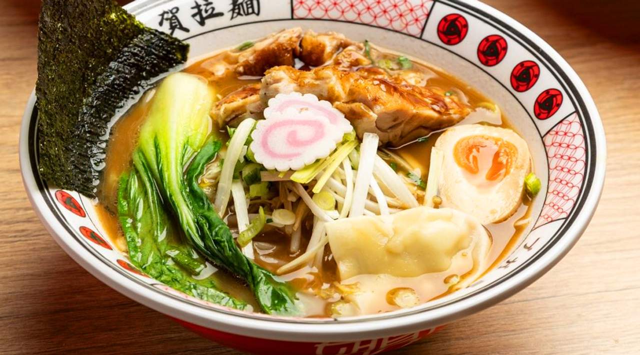 Fideos, pollo con salsa teriyaki y sésamo, wantán, bambú, pak choi, cebollino, cebolla frita, huevos marinados, caldo de soja, cilantro, brotes de soja