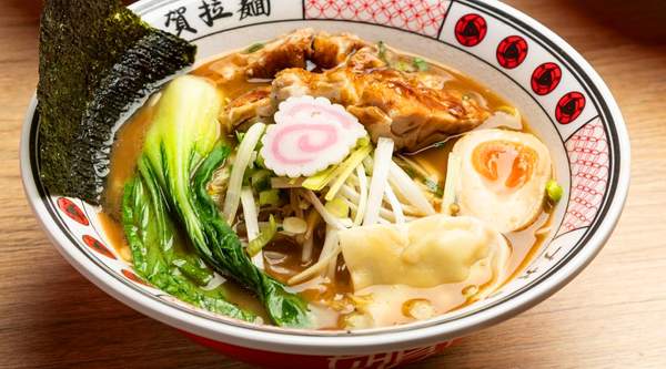 Fideos, pollo con salsa teriyaki y sésamo, wantán, bambú, pak choi, cebollino, cebolla frita, huevos marinados, caldo de soja, brotes de soja