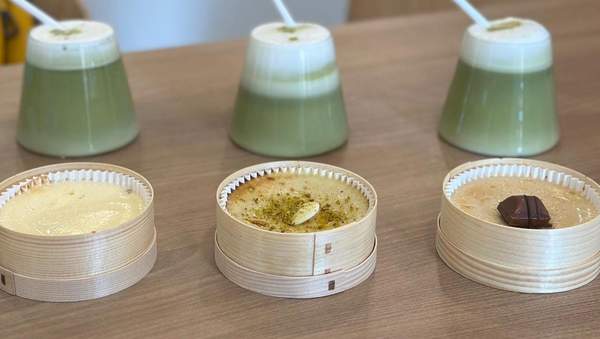 Matcha tradicional con coulis de fruta de la pasión y mango
