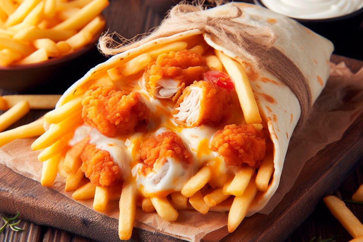 En torta de trigo grande relleno de Asado Cajùn, salsa de yogurt, patatas fritas y mezcla de quesos.