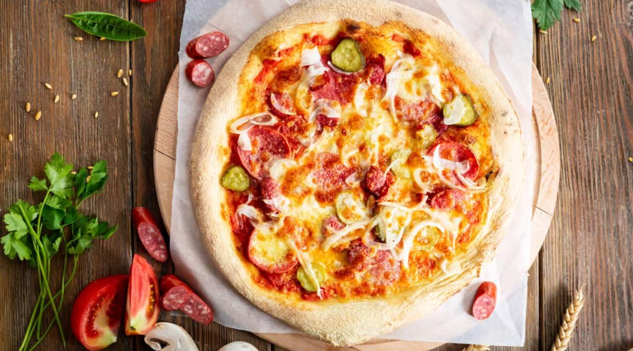 Salsa de tomate, mozzarella, aceite de oliva, alcachofa en conserva, salami, champiñones y jamón cocido