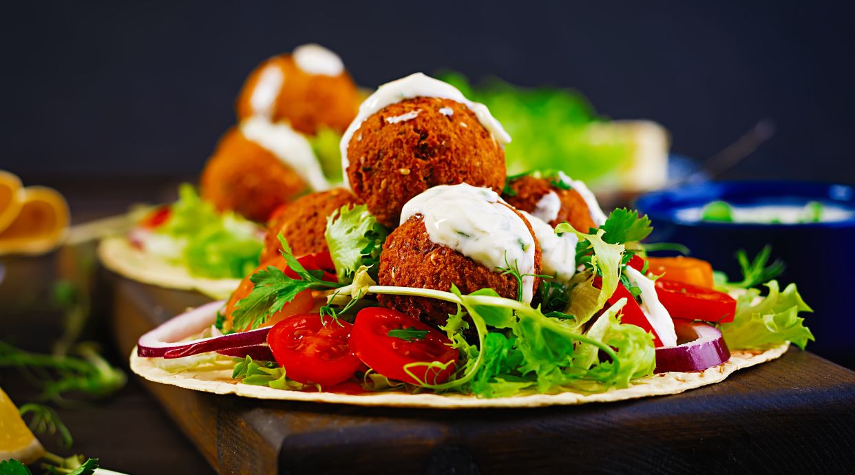 Puré de garbanzos fritos enrollado en pan de pita, ensalada y salsas