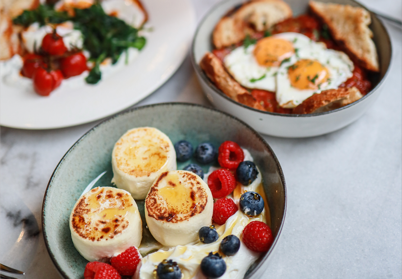 Yogurt especiado con 2 huevos pochados, dukkahm eneldo, cilantro, noisette con harissa, pepino encurtido y pan de masa madre.