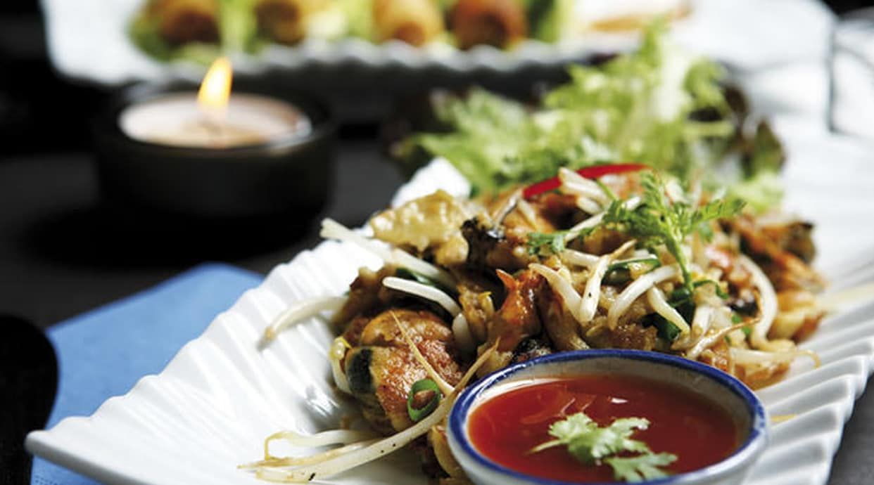 Pastel crujientes de gambas y cacahuete con salsa de ciruela tailandesa