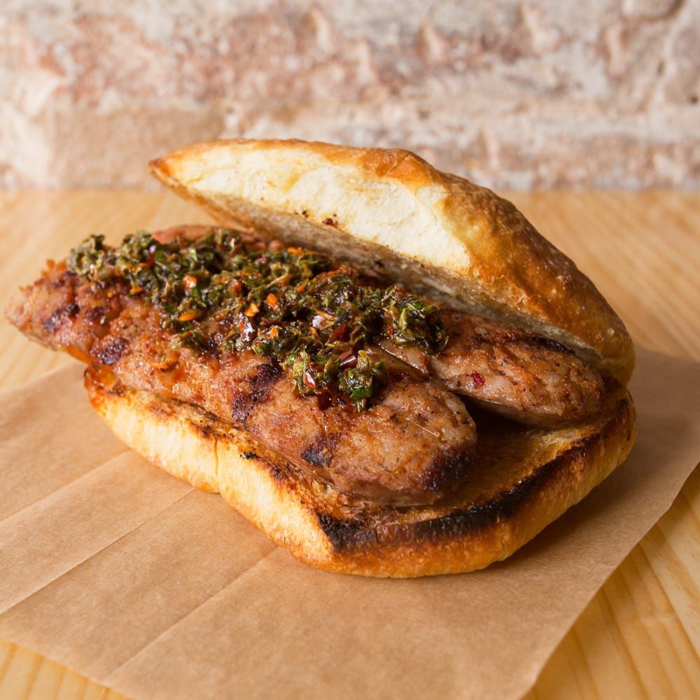 Nuestro chorizo criollo 100% Duroc, pan ciabatta de la casa, chimichurri de hierbas frescas y salsita criolla (250 G.). *Opción sin gluten: no disponible para delivery ** Recuerda, todos nuestros productos están elaborados en casa ;)