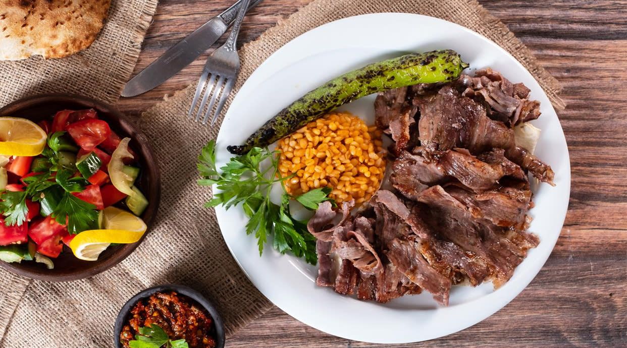 Pan fino enrollado con pinchos de ternera con especias turca a la parrilla, ensalada, pimiento cebolla asada y salsa