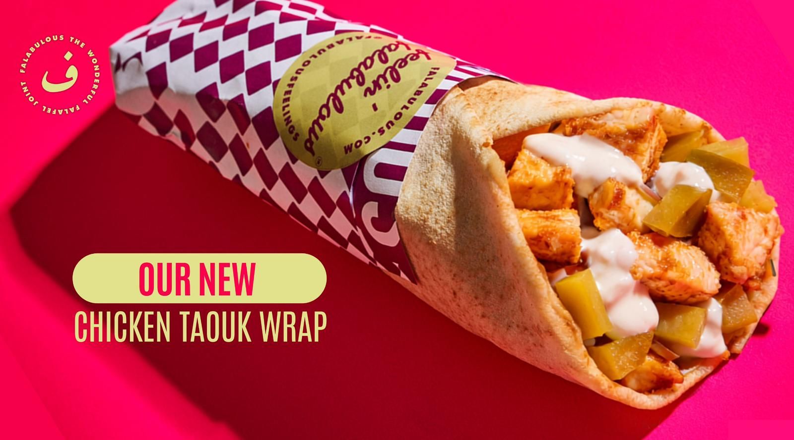 1x wrap de pollo tawook marinado al estilo libanés, a la parrilla, con toum casero (nuestro alioli libanés), pepinillos y zaatar fries, servido en pan de pita libanés caliente.