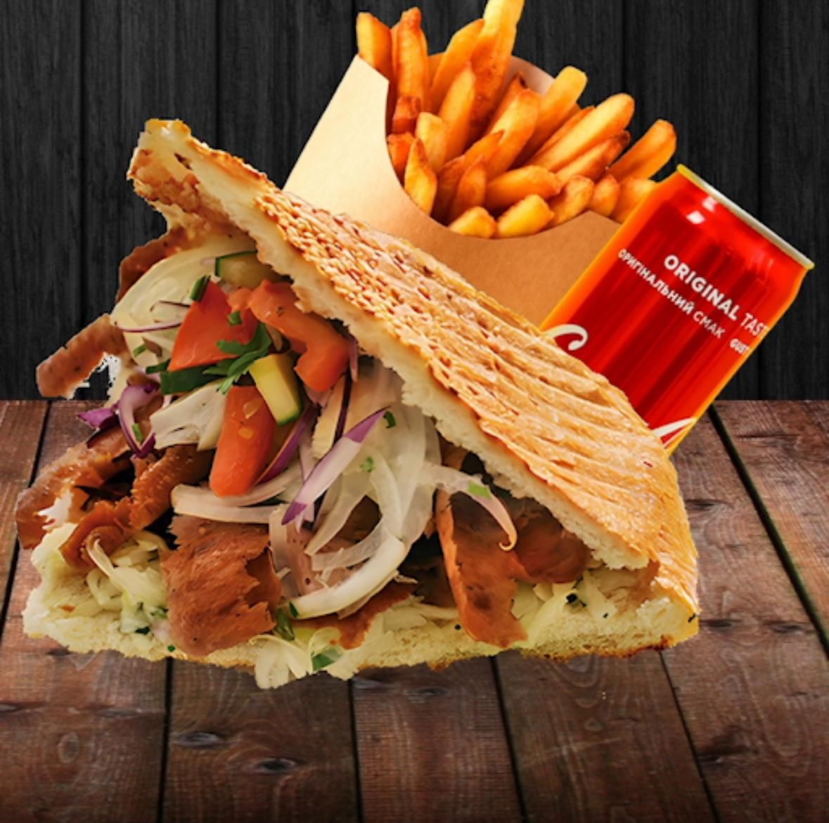 100% Filete de ternera y pollo, durum, tomate, pepinillo , cebolla, lechuga y salsas. Acompañado con patatas fritas y bebida a elegir