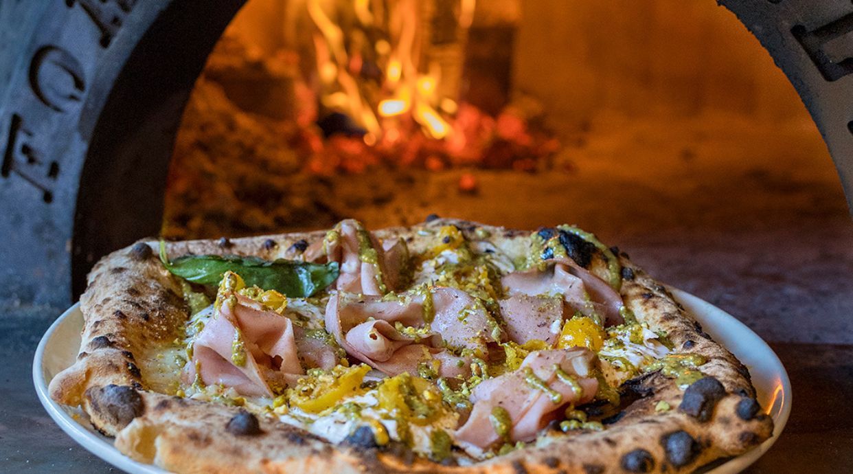 Mozzarella, mortadela al pistacho, stracciatella de burrata, tomate cherry amarillo, crema de pistacho, pistacho granulado, ralladura de limón y albahaca