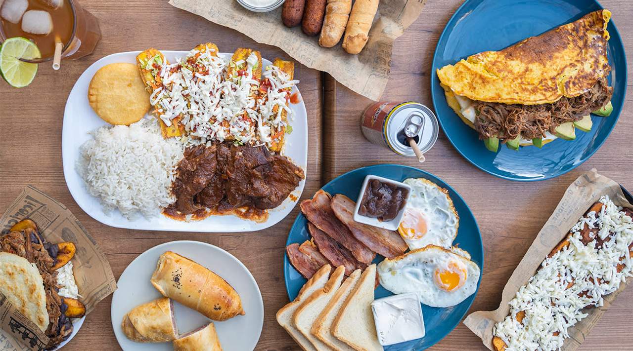 Carne mechada, queso, caraotas negras (alubias negras),aguacate, arepa y perico.