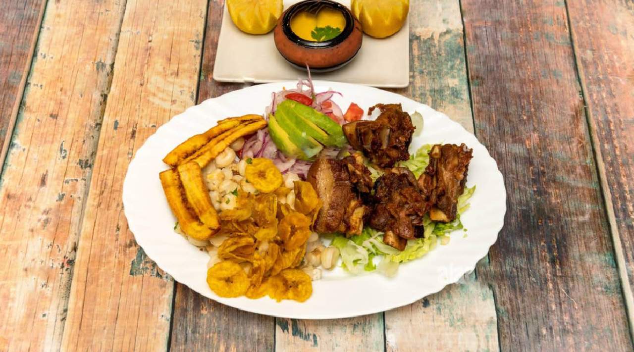 Carne de cerdo, mote, torta de patata, plátano maduro y ensalada