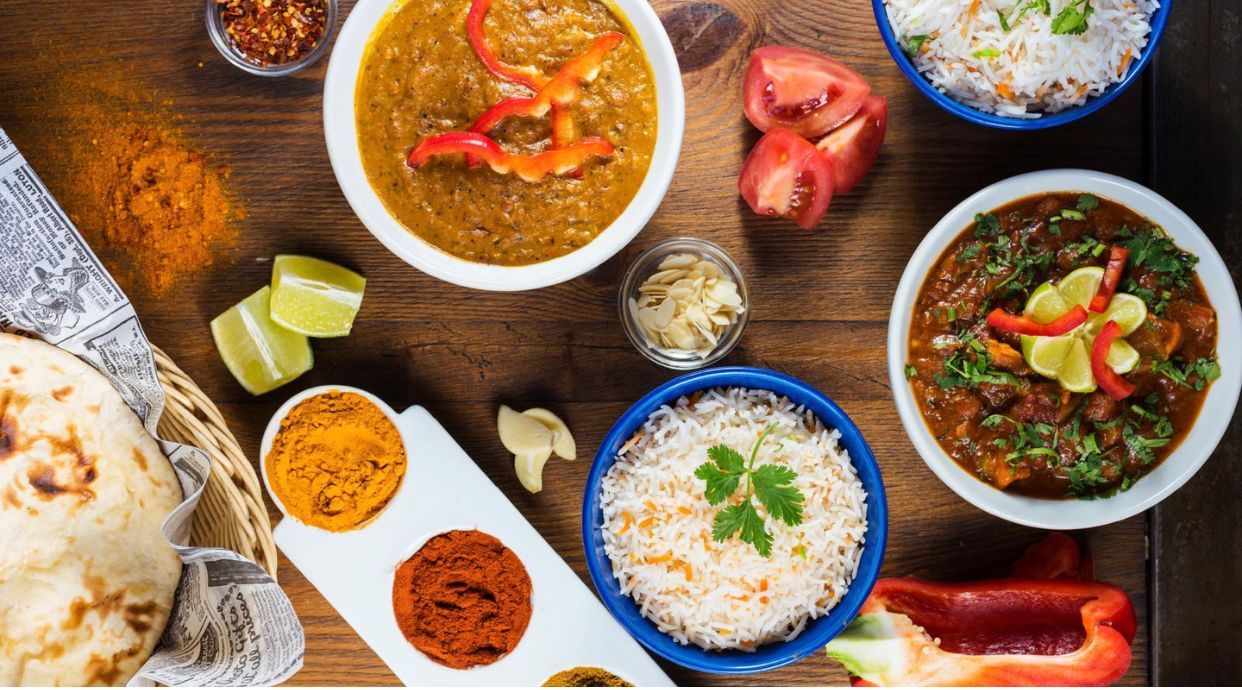 Pensado para dos personas que estén empezando a descubrir la India: Pakoras y Bhel Puri con Naan relleno de patats u guisantes, Curry Pollo Makhani con arrozy Naan de queso. Pequeño postre de Mango Lassi