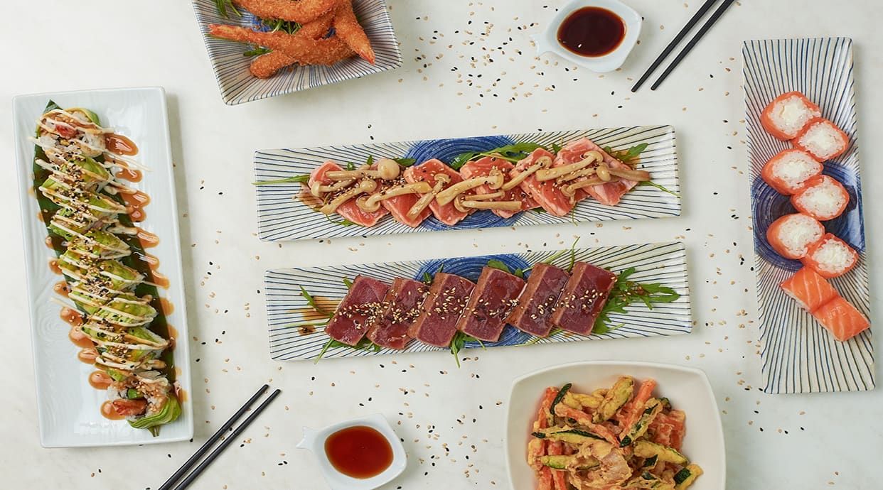 6 Nigiri de salmón, 3 nigiri de dorada, 3 nigiri de atún, 2 gunkan ikura, 8 maki de salmón, 8 maki de atún, 9 sashimi salmón, 6 sashimi atún, 8 California salmón