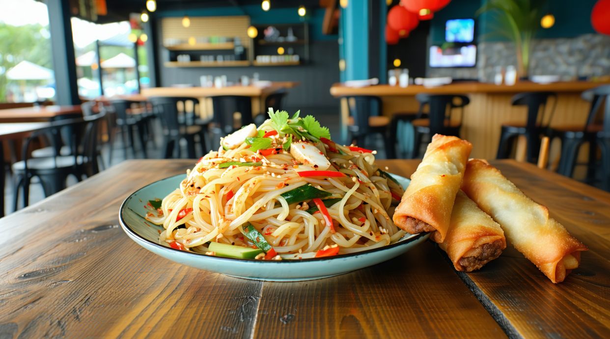 Tallarines de arroz salteado con huevo, col verde, zanahoria, pimiento, brotes de soja, cebolla y cacahuetes, cebollinos con salsa pad thai