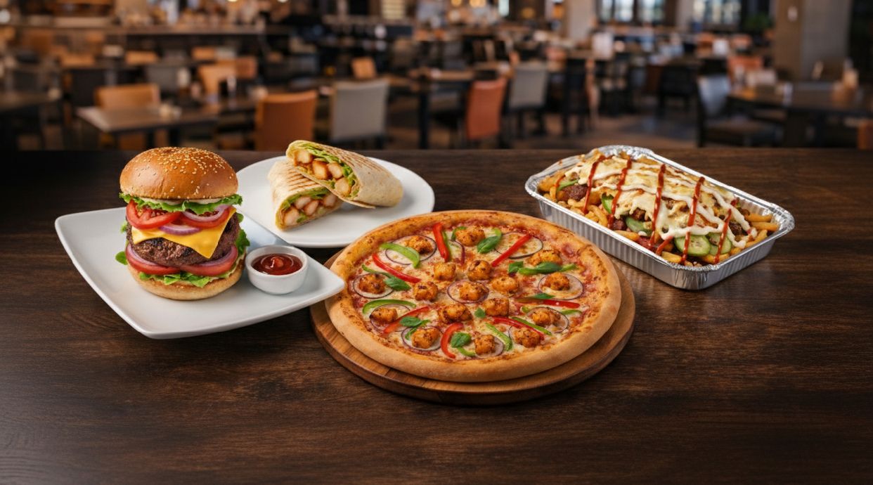 Con ternera, pollo, pollo tikka, jamón y pepperoni.