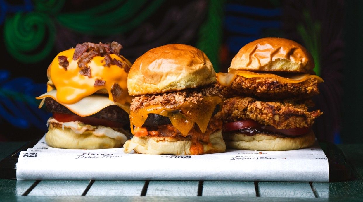 Carne 100% vacuno, chuleta ahumada, pechuga de pollo, panceta, huevo, tomate, lechuga, papas y salsa Pistazi remix