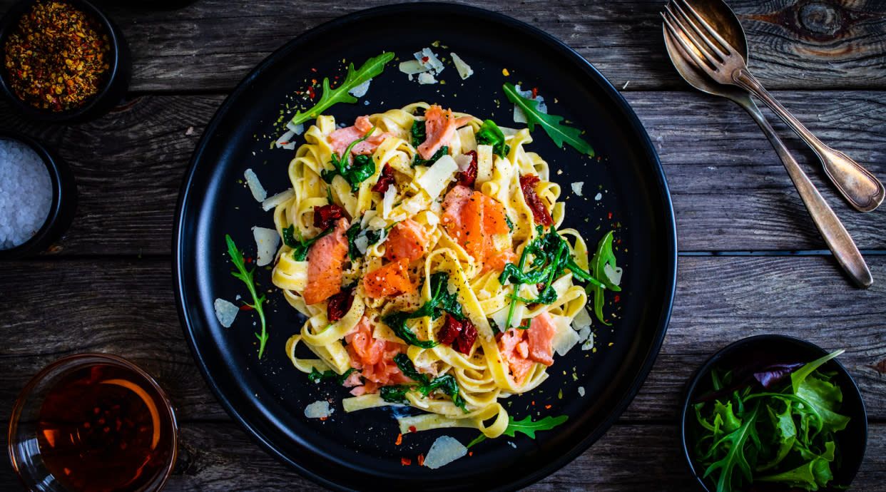 Fetuccini con setas y bacon salteado